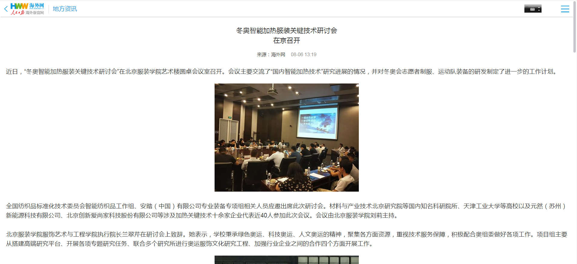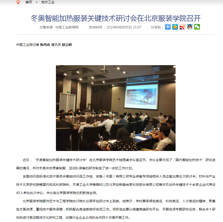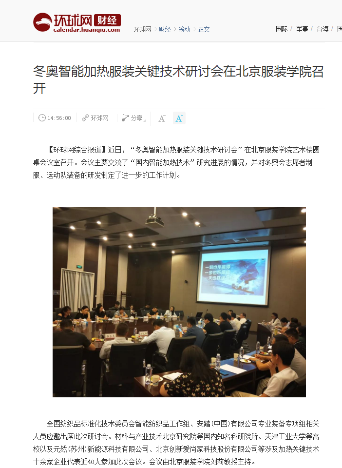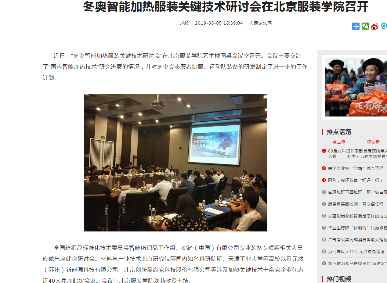 2019年7月31日,“冬奧智能加熱服裝關鍵技術研討會”在北京服裝學院藝術樓圓桌會議室召開。會議主要交流了“國內(nèi)智能加熱技術”研究進展的情況,并對冬奧會志愿者制服、運動隊裝備的研發(fā)制定了進一步的工作計劃,元然(蘇州)新能源科技公司董事長張金蓮受邀參與了本次研討會。